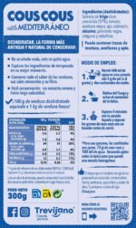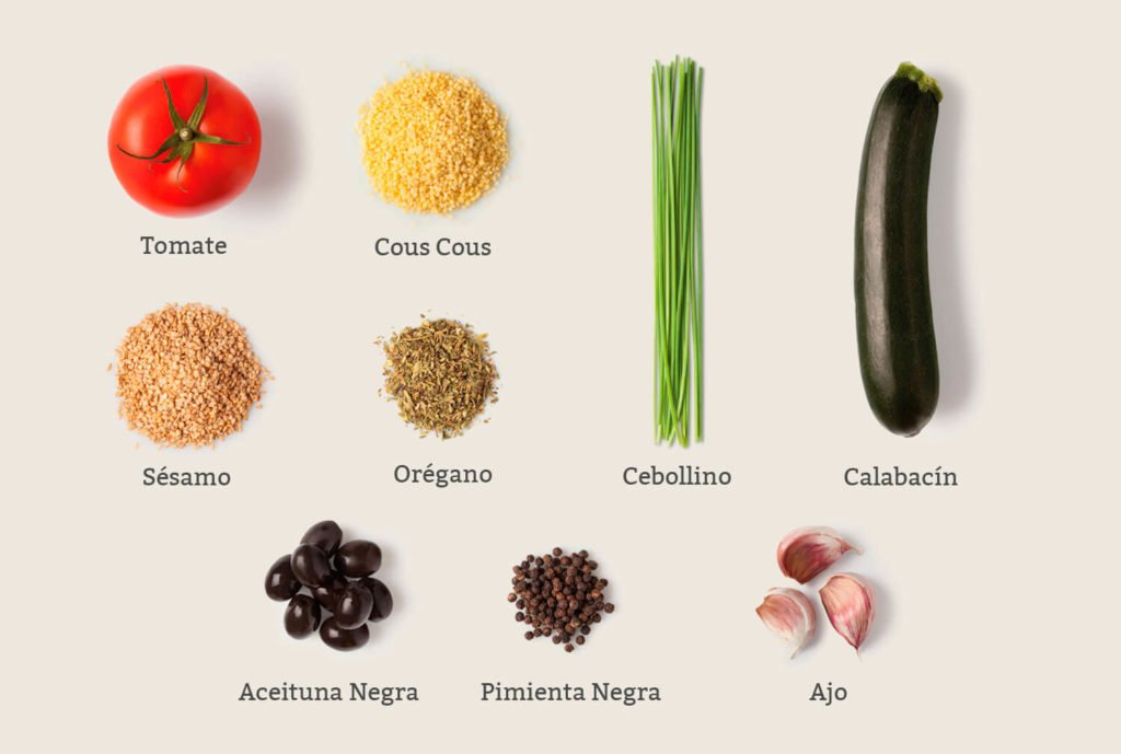 Ahora preparar un buen cuscús te será fácil y rapidísimo. En cinco minutos una receta vegana muy sana, verdadera dieta mediterránea. Ingredientes: cous cous, tomate deshidratado, aceituna negra, calabacín, sésamo, pimienta negra, orégano, cebollino… y nada más. Alérgenos: puede contener trazas de mostaza, avellanas y apio. El trigo y el sésamo son productos alérgenos.